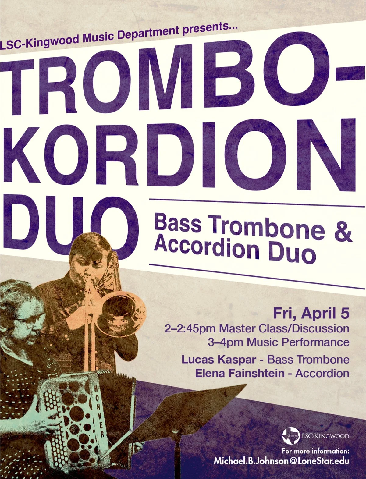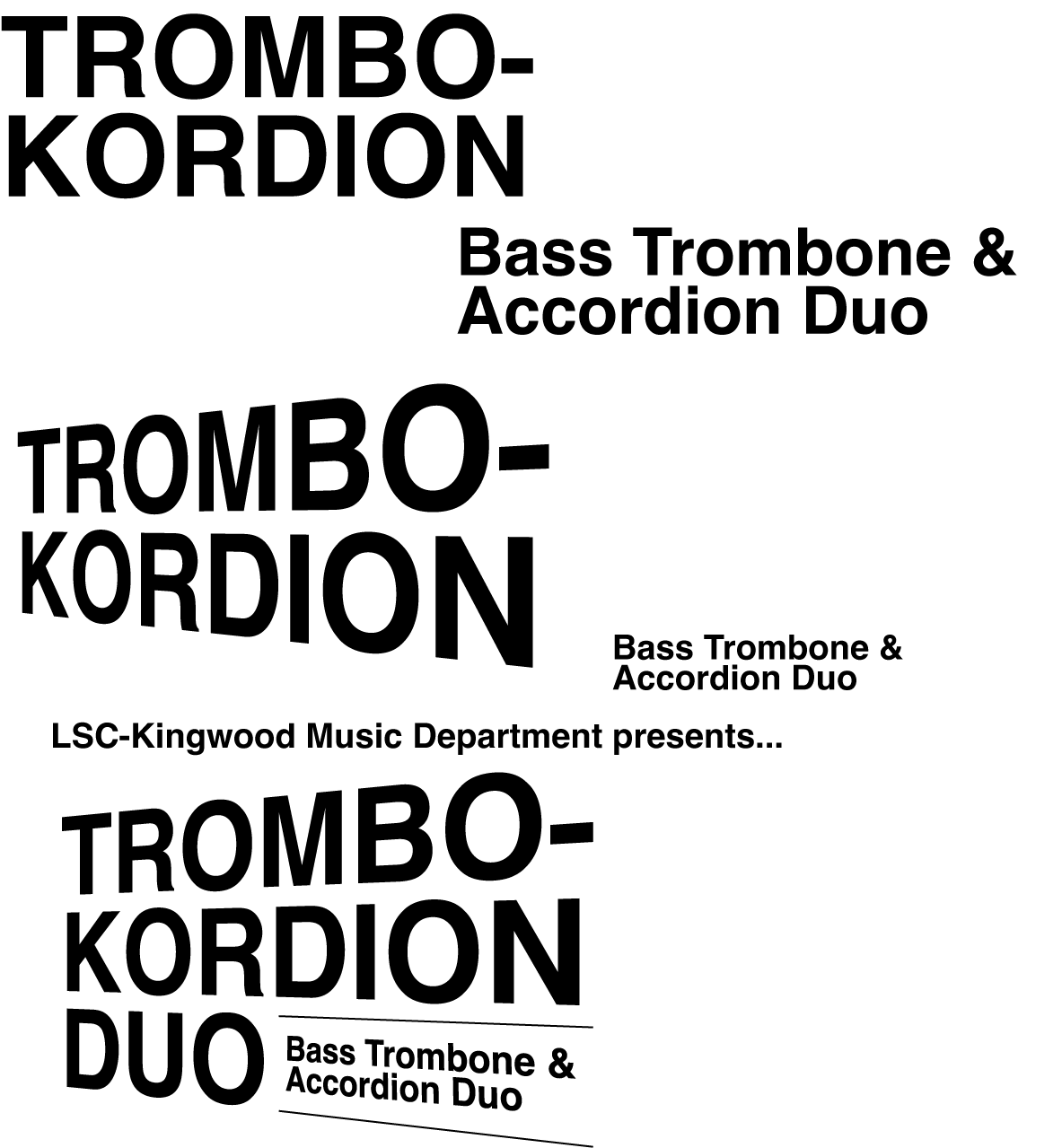 The Trombo-Kordion Duo is a unique musical act that wanted to advertise their exciting discussion and performance event. I aimed to emphasize the combination of instruments through the sizing of the group’s name and making the visuals dynamic.
